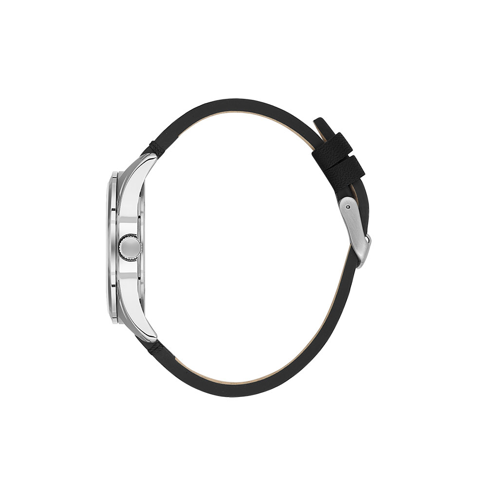 Ceasul este completat de o curea din piele neagra, eleganta si confortabila, ce se inchide cu o catarama simpla, asigurand o fixare sigura pe durata purtarii. Rezistenta la apa de pana la 5 atm il face ideal pentru utilizare zilnica, fiind protejat in fata intemperiilor sau a accidentelor minore cu apa.