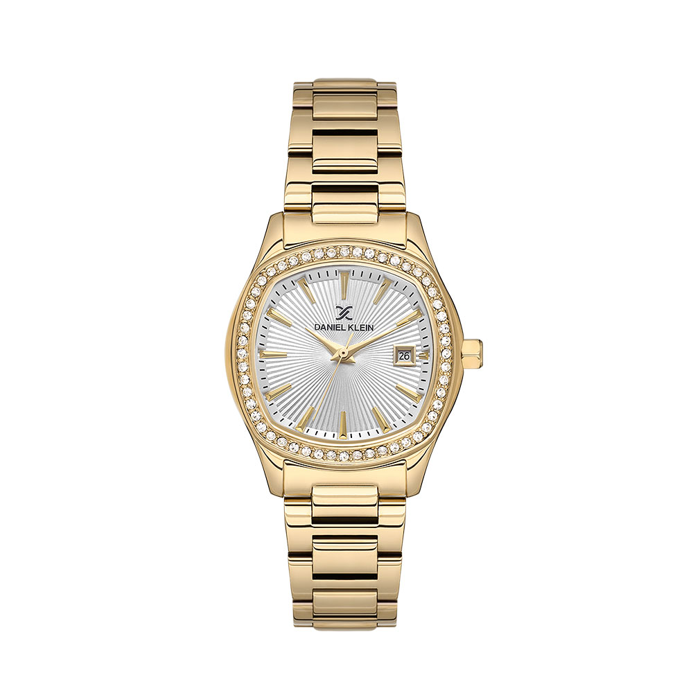 Carcasa rotunda din aliaj metalic auriu, cu diametru de 32 mm si grosime de 8 mm, este incadrata de un inel cu cristale fine, ce adauga un plus de stralucire si stil. Cadranul argintiu cu textura radianta este pus in valoare de marcajele aurii si afisajul analogic clar, completat de o fereastra pentru afisarea datei.
