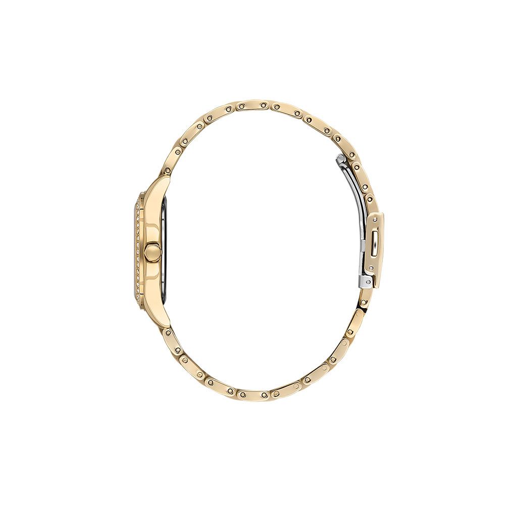 Bratara din otel inoxidabil auriu, cu lungime de 195 mm si latime de 15 mm, este prevazuta cu sistem de inchidere tip fluture, asigurand o purtare confortabila si sigura. Geamul din cristal mineral protejeaza mecanismul japonez Epson Vx12e11, recunoscut pentru precizia sa si o abatere de doar ±20 secunde/luna.