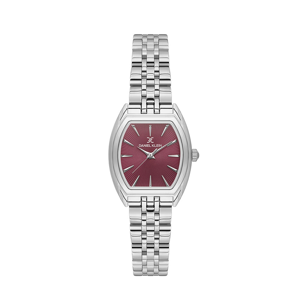 Carcasa ovala din aliaj metalic argintiu are dimensiuni compacte (31 mm lungime si 26 mm latime), oferind un aspect feminin si discret. Cadranul burgund adauga un plus de personalitate, fiind completat de marcaje argintii minimaliste si afisaj analogic usor de citit.