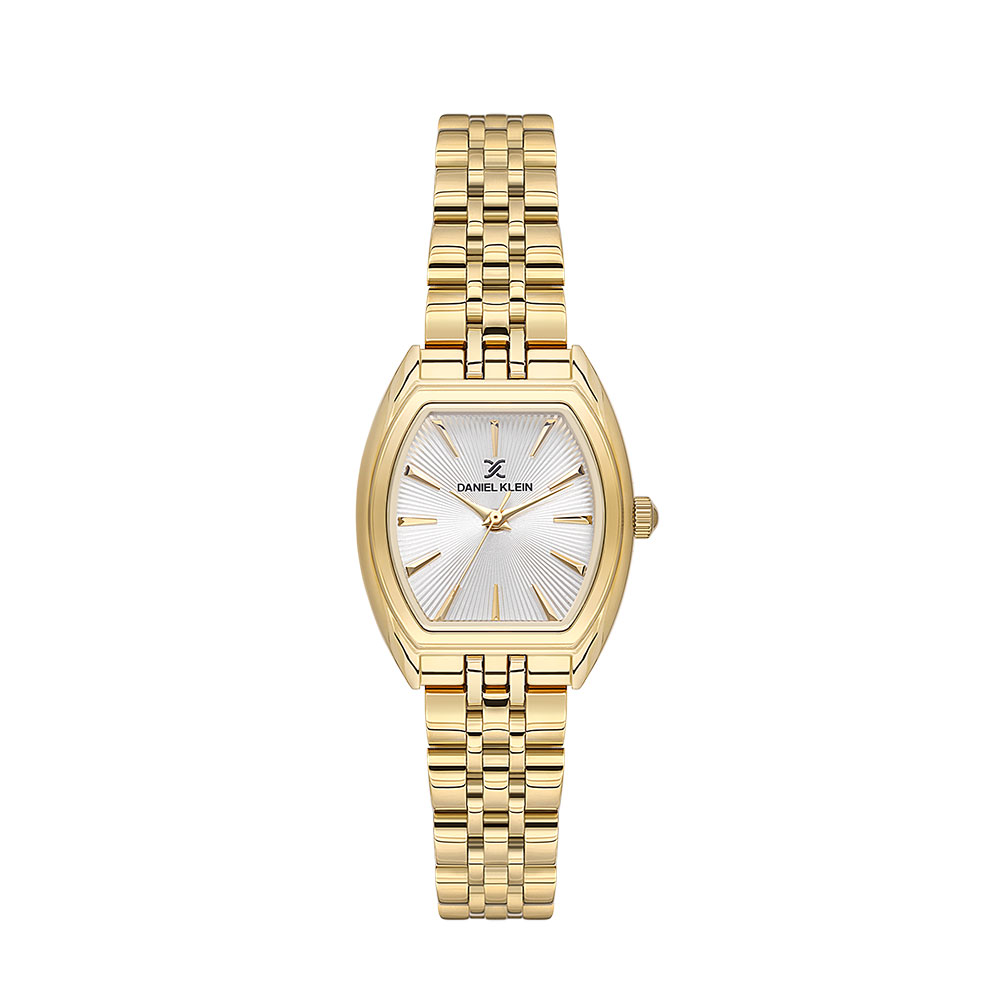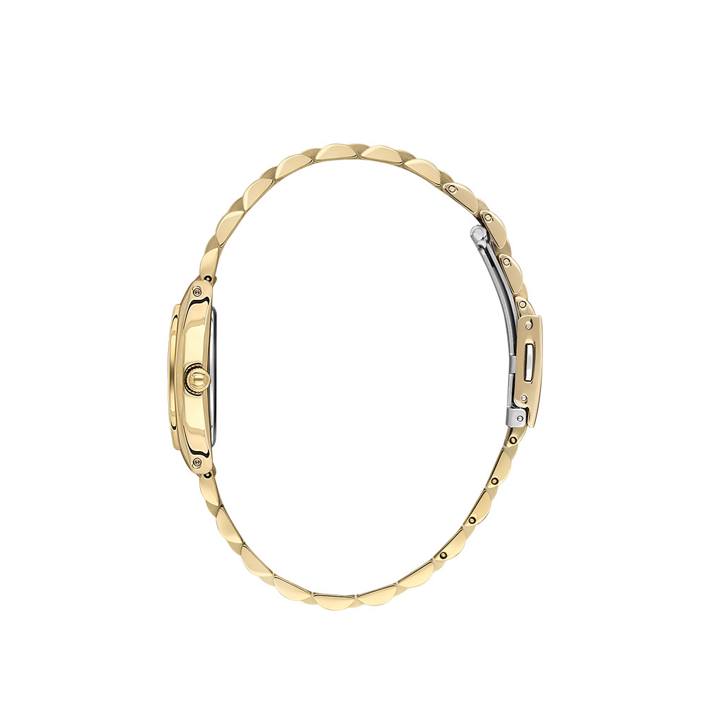 Carcasa ovala, realizata din aliaj metalic cu finisaj auriu, se imbina armonios cu bratara din otel inoxidabil, oferind o rezistenta sporita si un aspect premium. Cadranul argintiu cu afisaj analogic adauga un plus de eleganta, fiind protejat de un geam din cristal mineral durabil, rezistent la zgarieturi.