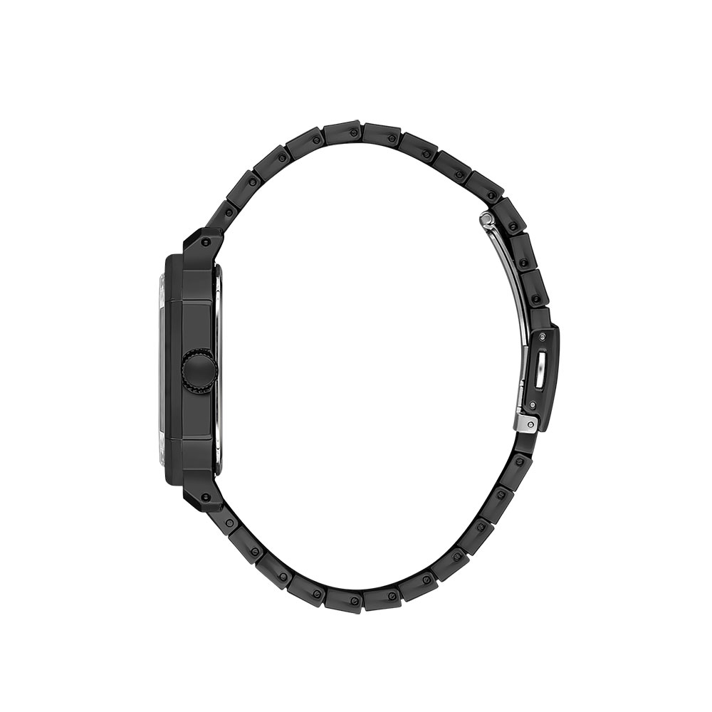 Realizat din aliaj metalic rezistent si completat de o bratara solida din otel inoxidabil negru, ceasul imbina durabilitatea cu eleganta. Cadranul negru este completat de indicatoare si marcaje aurii, creand un contrast subtil si sofisticat. Geamul din cristal mineral protejeaza afisajul analogic, iar mecanismul japonez Miyota 2315 garanteaza o precizie fiabila (+/- 20 secunde/luna).