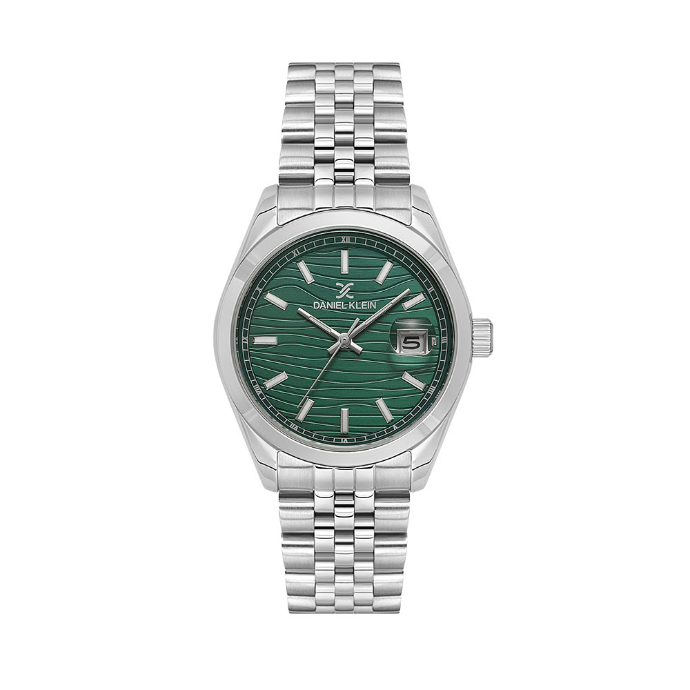 Cu o carcasa rotunda din aliaj metalic de 40 mm si o grosime de 12 mm, ceasul se aseaza confortabil pe incheietura, iar bratara din otel inoxidabil argintiu completeaza perfect look-ul sofisticat. Cadranul verde intens, texturat cu un model ondulat, adauga profunzime vizuala si un aer distinctiv. Indicatorii si limbile argintii ofera un contrast excelent pentru o citire facila a orei.