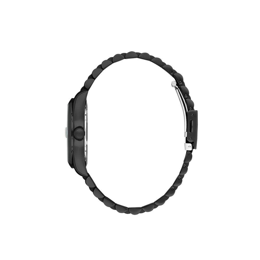 Carcasa rotunda din aliaj metalic, cu diametru de 40 mm si grosime de 12 mm, se imbina armonios cu bratara din otel inoxidabil negru, prevazuta cu sistem de inchidere tip fluture, oferind confort si siguranta la purtare. Cadranul negru este decorat cu un model subtil in valuri si marcaje argintii, completat de o fereastra pentru afisarea datei, pozitionata la ora 3.