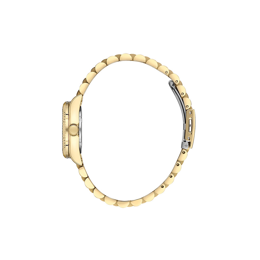 Carcasa rotunda, realizata din aliaj metalic auriu, are dimensiuni delicate (27 mm x 27 mm) si este completata de un cadran argintiu minimalist, cu marcaje aurii si geam din cristal mineral rezistent la zgarieturi. Bratara din otel inoxidabil auriu, cu sistem de inchidere tip fluture, adauga un plus de confort si siguranta la purtare.