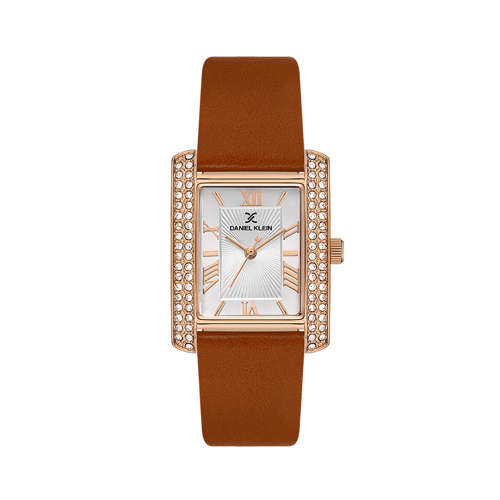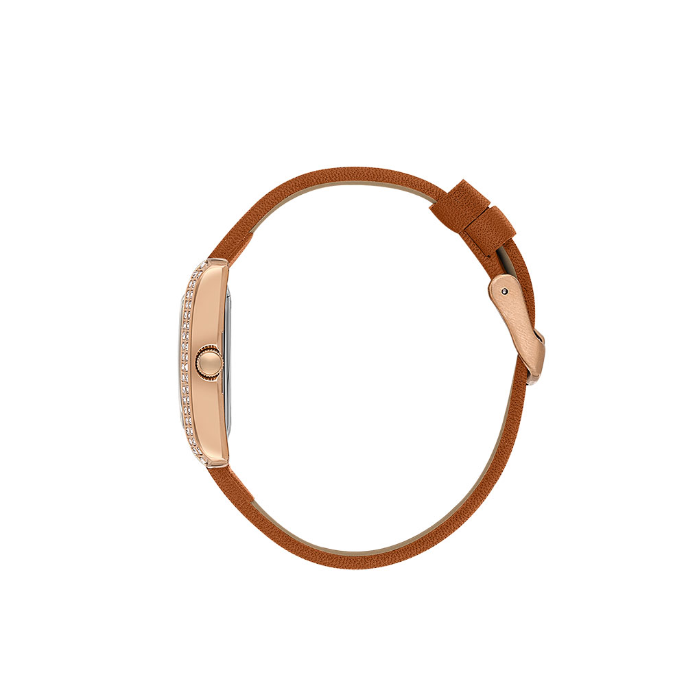 Carcasa dreptunghiulara din aliaj metalic cu finisaj auriu rose este decorata cu cristale stralucitoare pe laterale, oferind un plus de eleganta si stralucire. Cadranul argintiu este pus in valoare de marcajele orare romane si de designul texturat, oferind o lizibilitate excelenta si un aspect sofisticat.