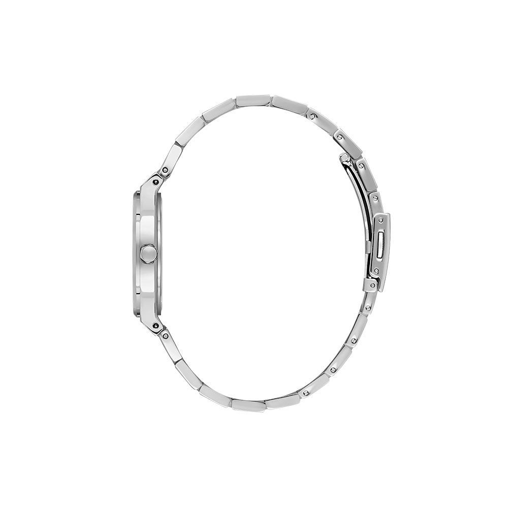 Carcasa rotunda, realizata din aliaj metalic argintiu, are un diametru de 31 mm si o grosime de doar 7 mm, oferind un profil subtire si confortabil pe incheietura. Cadranul roz cu finisaj mat si marcaje argintii adauga o nota feminina si moderna, perfect completata de bratara din otel inoxidabil in aceeasi nuanta metalica, cu sistem de inchidere tip fluture pentru siguranta si usurinta in utilizare.