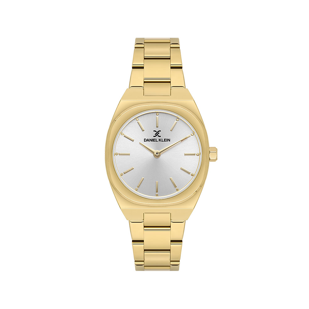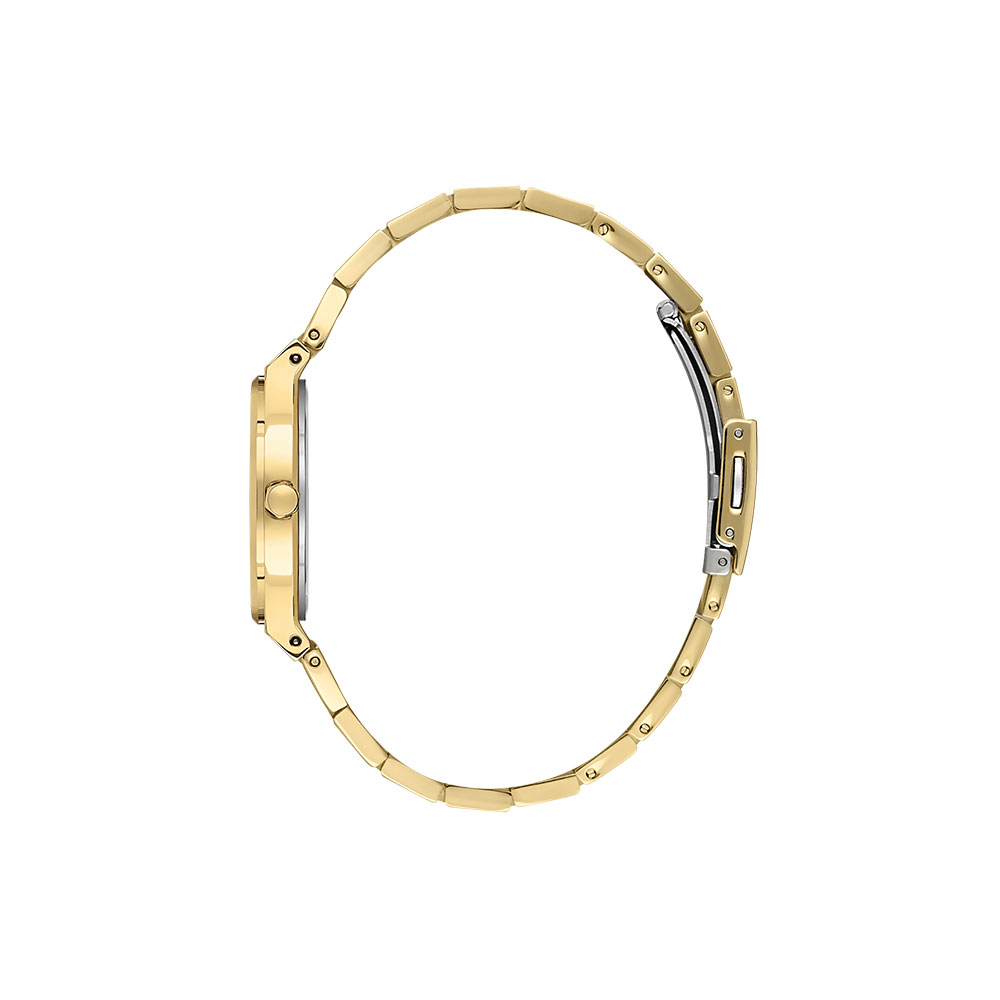 Carcasa rotunda, cu un diametru de 31 mm, este realizata din aliaj metalic de inalta calitate si finisata intr-o nuanta aurie stralucitoare, care confera un plus de sofisticare. Cadranul argintiu cu afisaj analogic si marcaje simple accentueaza aspectul elegant si ofera o vizibilitate excelenta. Bratara din otel inoxidabil auriu, cu sistem de inchidere tip fluture, asigura confort si siguranta la purtare.