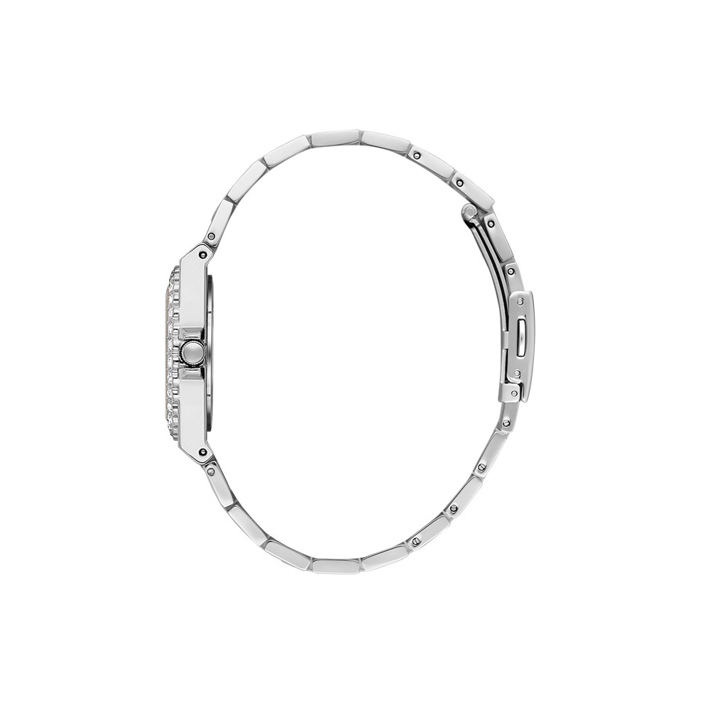 Carcasa din aliaj metalic argintiu este decorata cu o rama stralucitoare, ornata cu cristale transparente, ce adauga o nota sofisticata si feminina. Cadranul argintiu, cu afisaj analogic si marcaje subtile, ofera o lizibilitate excelenta si un aspect elegant, completat de geamul din cristal mineral rezistent la zgarieturi.