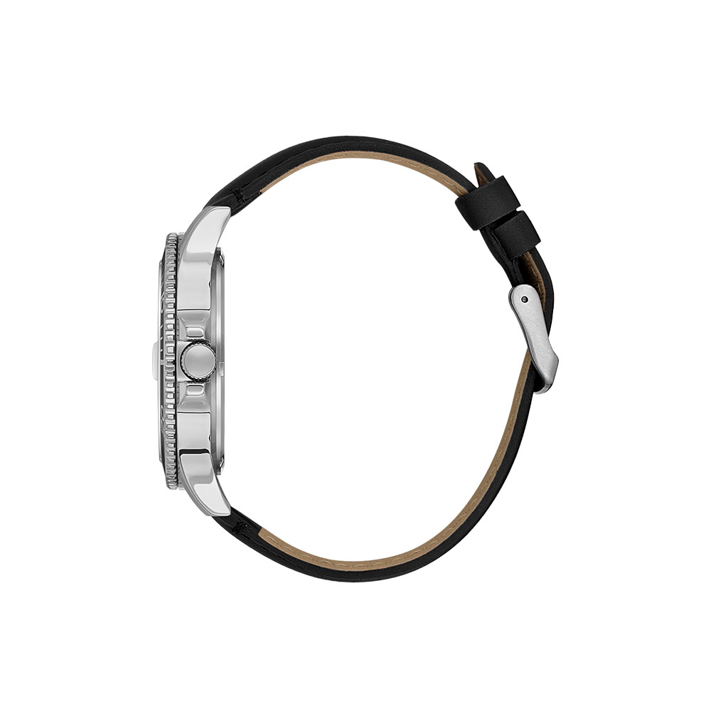Cu o carcasa rotunda din aliaj metalic, finisata in negru si un diametru de 44 mm, ceasul impresioneaza prin aspectul sau solid si echilibrat. Cadranul negru este protejat de un geam din cristal mineral, rezistent la zgarieturi, iar afisajul analogic cu indicatori mari si vizibili ofera o citire usoara a orei.