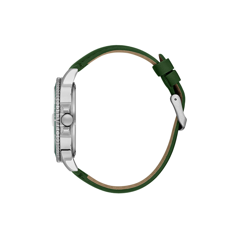 Bratara din piele verde cu sistem de inchidere cu catarama adauga un plus de confort si eleganta, fiind potrivita pentru purtare zilnica. Mecanismul japonez Miyota 2315, cu precizie de ±20 secunde/luna, asigura o functionare fiabila in timp, iar rezistenta la apa de 5 ATM permite utilizarea in conditii obisnuite, precum ploaie sau stropire accidentala.