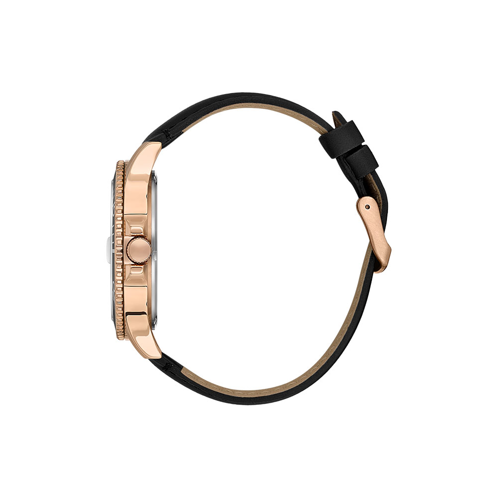 Carcasa rotunda din aliaj metalic are un finisaj auriu rose, care contrasteaza armonios cu cadranul negru mat. Aceasta combinatie cromatica adauga un plus de sofisticare, in timp ce geamul din cristal mineral protejeaza afisajul impotriva zgarieturilor si socurilor usoare.