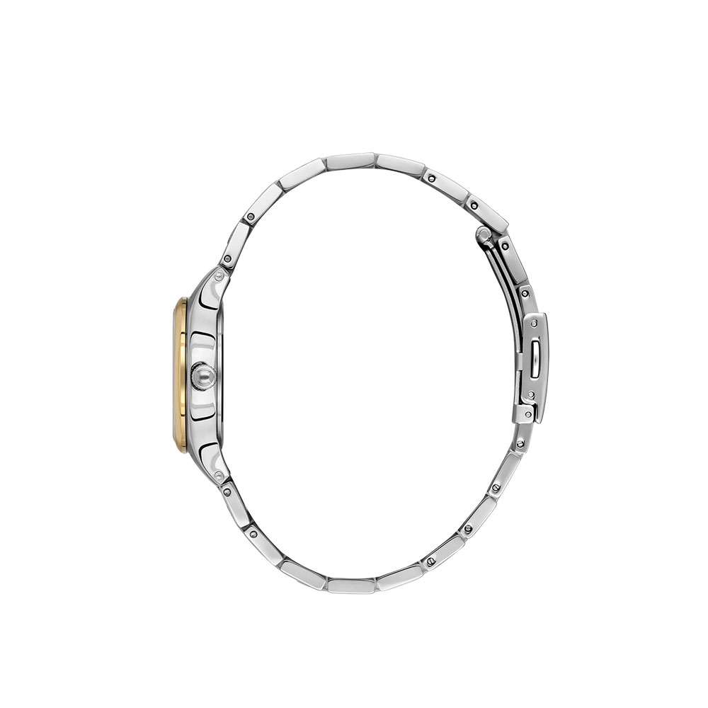Bratara metalica bicolora, din otel inoxidabil, combina accentele aurii cu finisajele argintii pentru un efect vizual sofisticat. Inchiderea tip fluture asigura confort si siguranta la purtare.