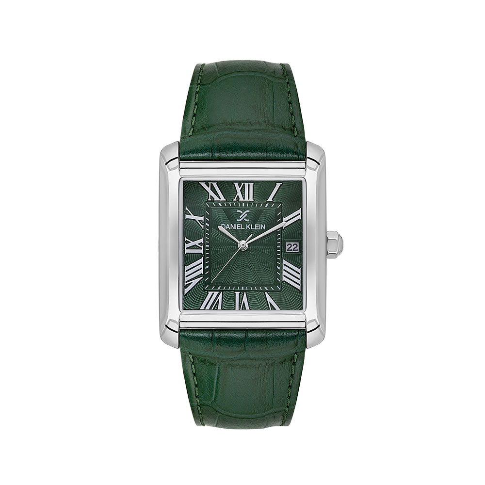 Carcasa patrata, realizata din aliaj metalic argintiu, are dimensiuni echilibrate (35 mm x 35 mm) si o grosime de 12 mm, oferind o prezenta discreta dar impunatoare pe incheietura. Cadranul verde inchis este accentuat de cifre romane albe si un model subtil in relief, care adauga profunzime vizuala si rafinament.