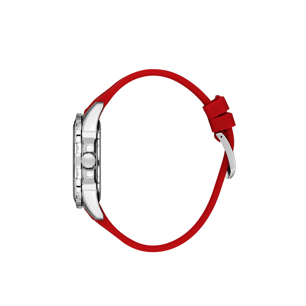 - Bratara din silicon rosu adauga un contrast vizual puternic si asigura confortul in purtare, fiind ideala pentru activitati zilnice sau sportive.
