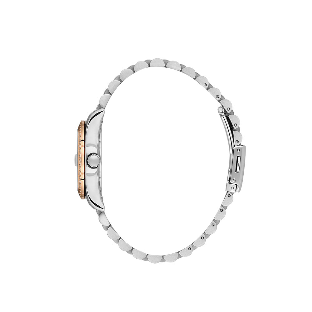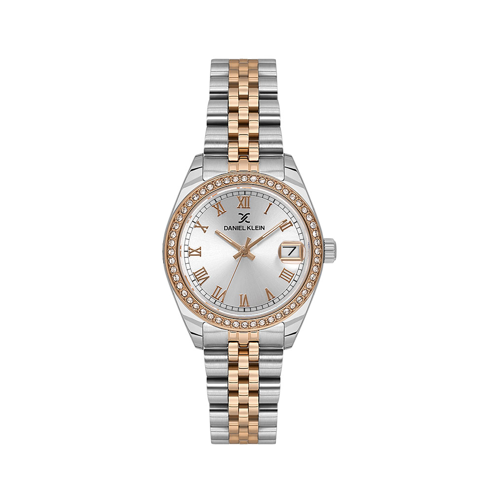 Carcasa rotunda din aliaj metalic, finisata intr-o nuanta sofisticata de auriu rose, incadreaza un cadran argintiu decorat cu cifre romane si detalii fine, protejat de un geam din cristal mineral rezistent la zgarieturi. Bratara din otel inoxidabil are un design bicolor elegant – argintiu si auriu rose – oferind un contrast vizual placut si un plus de stil.