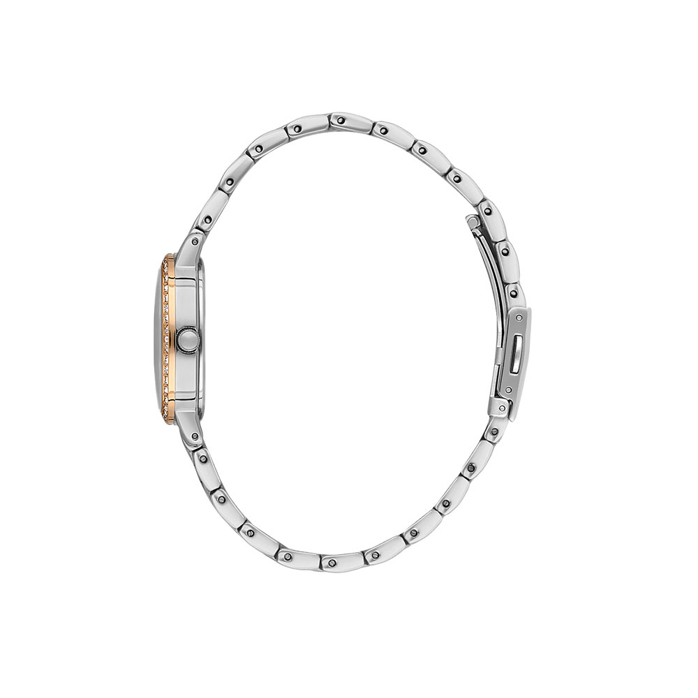 Carcasa ovala, cu dimensiuni delicate de 28 mm lungime si 22 mm latime, este realizata din aliaj metalic de culoare auriu rose, decorata cu cristale stralucitoare care contureaza discret cadranul alb sidefat. Bratara din otel inoxidabil are un design bicolor sofisticat, combinand nuante de auriu rose si argintiu, si este prevazuta cu un sistem de inchidere tip fluture, asigurand o fixare confortabila si sigura pe incheietura.