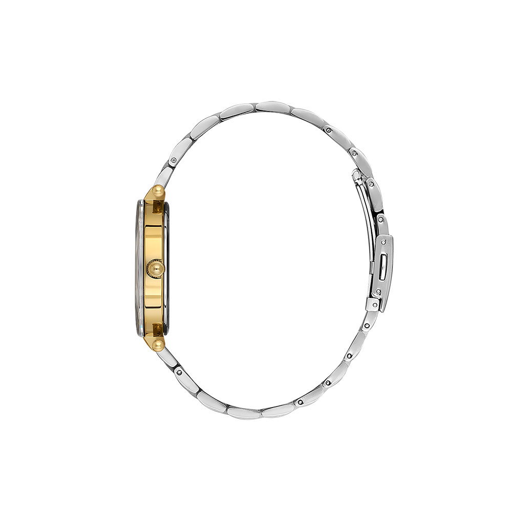 Bratara din otel inoxidabil adauga durabilitate si un plus de stil, fiind realizata in combinatie auriu-argintiu pentru un efect vizual deosebit. Sistemul de inchidere tip fluture asigura confort si siguranta la purtare, iar dimensiunile delicate ale ceasului (34 mm lungime, 25 mm latime si 8 mm grosime) il fac usor de integrat in tinutele de zi cu zi sau in cele elegante.