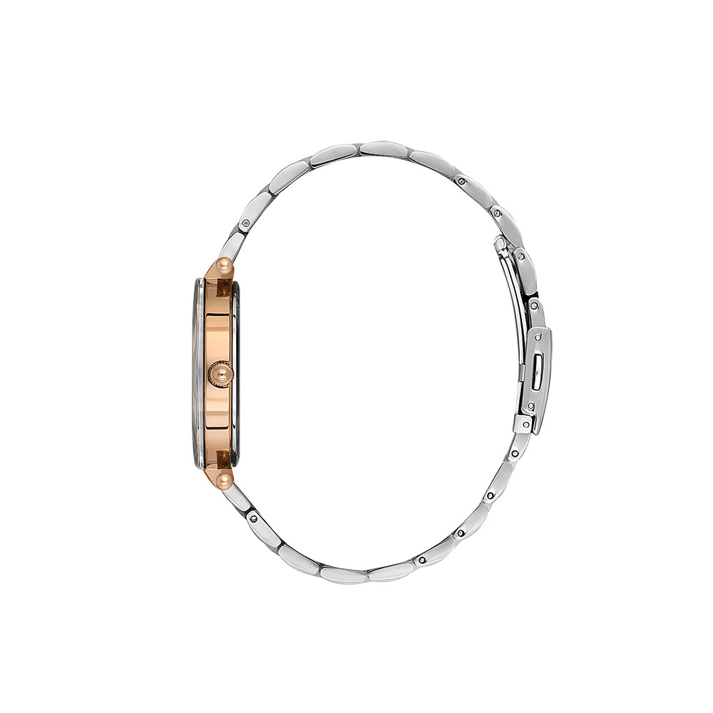 Bratara din otel inoxidabil are un design bicolor elegant, combinand armonios tonurile de auriu rose si argintiu. Sistemul de inchidere tip fluture asigura o fixare sigura si confortabila pe incheietura. Geamul din cristal mineral protejeaza eficient mecanismul intern impotriva zgarieturilor si socurilor usoare.