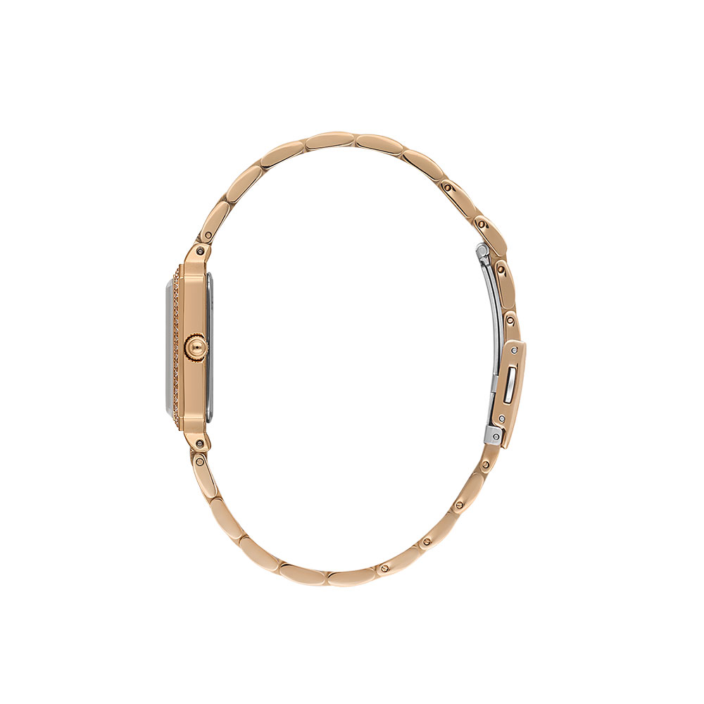 Cadranul bleumarin, cu textura satinata si marcaje fine, este completat de cristale aplicate discret la orele 3, 6, 9 si 12, oferind un joc subtil de lumina si eleganta. Geamul din cristal mineral asigura o buna rezistenta la zgarieturi, iar bratara din otel inoxidabil auriu rose, cu sistem de inchidere tip fluture, garanteaza confort si siguranta in purtare.