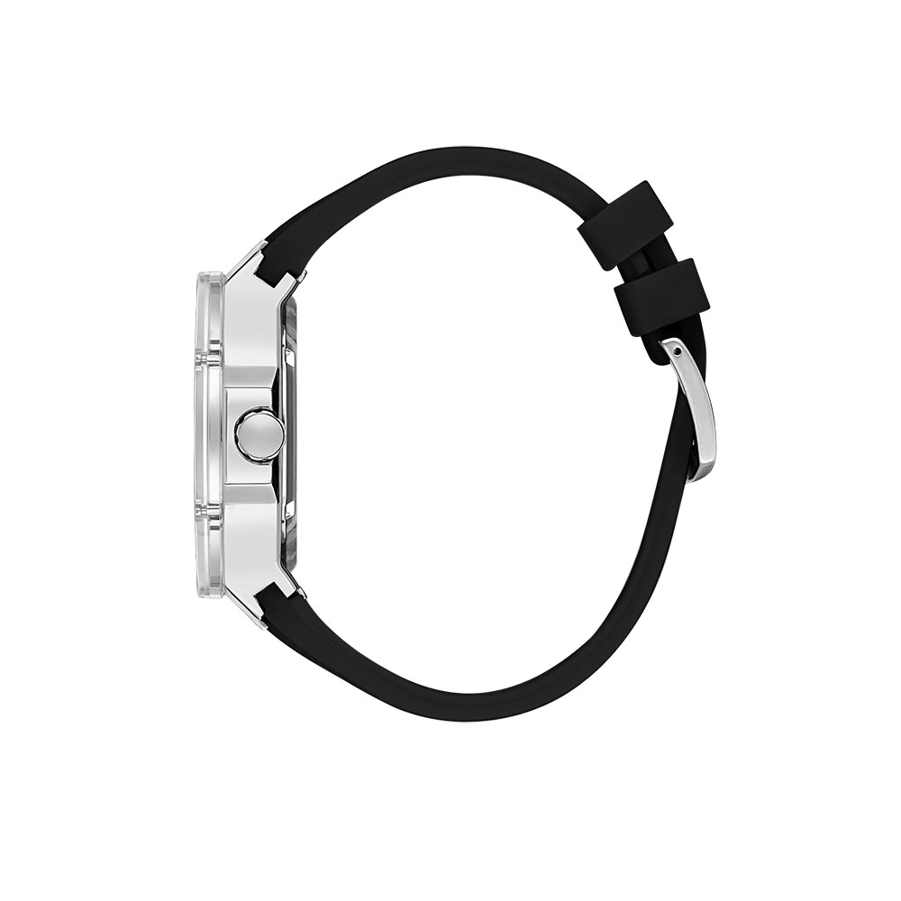 Carcasa rotunda, cu diametrul de 48 mm si grosimea de 15 mm, este realizata din aliaj metalic de culoare argintiu cu accente negre, oferind un contrast elegant si modern. Geamul din cristal mineral protejeaza afisajul analogic, asigurand o buna vizibilitate si rezistenta la zgarieturi. Bratara din silicon negru cu lungimea de 215 mm si latimea de 28 mm este confortabila si durabila, perfecta pentru utilizare zilnica.