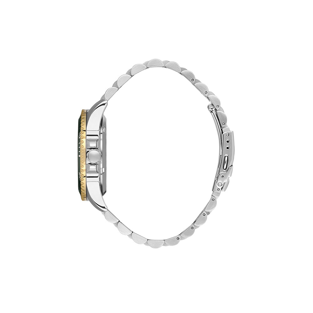 Carcasa rotunda de 44 mm este realizata din aliaj metalic finisat in auriu, completata de o bratara solida din otel inoxidabil in tonuri auriu si argintiu. Acest contrast vizual elegant este accentuat de un cadran verde intens, protejat de cristal mineral rezistent la zgarieturi.