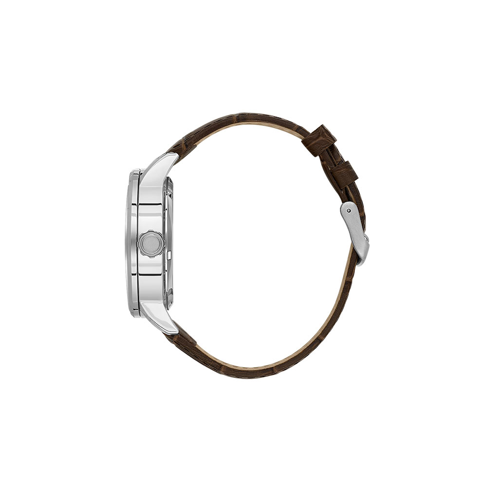 Carcasa rotunda de 43 mm, realizata din aliaj metalic argintiu, se integreaza armonios cu geamul din cristal mineral, asigurand durabilitate si rezistenta la zgarieturi. Ceasul dispune de afisaj analogic cu functia Dual Time, perfect pentru calatorii sau pentru cei care doresc sa urmareasca doua fusuri orare simultan.