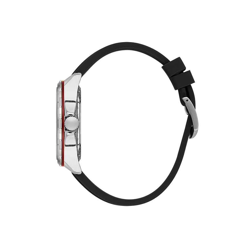Ceasul este dotat cu un geam din cristal mineral, rezistent la zgarieturi, si este potrivit pentru utilizare zilnica datorita rezistentei la apa de 5 ATM. Bratara din silicon negru, cu lungimea de 210 mm si latimea de 21 mm, asigura confort si durabilitate, fiind fixata cu o catarama clasica.