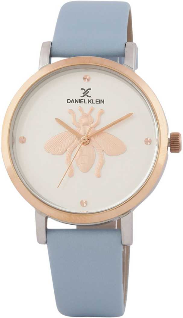 Cadran decorat cu imaginea unei albine; carcasa argintie cu bezel decorativ auriu rose.