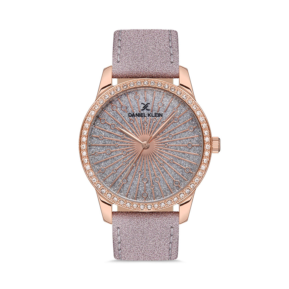 Cadranul rotund, de 40 mm, este decorat cu pudra de zirconii si accente radiale delicate, oferind un efect vizual spectaculos. Marginile carcasei in nuanta auriu rose sunt impodobite cu zirconii albe, sporind farmecul si rafinamentul acestui model. Geamul din cristal mineral asigura protectie impotriva zgarieturilor, mentinand aspectul impecabil al ceasului.
