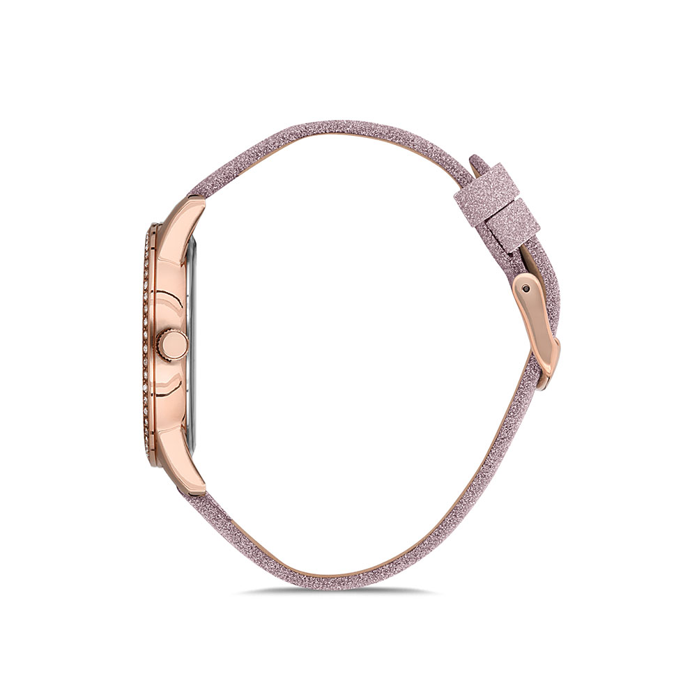 Cureaua din piele roz, cu finisaj stralucitor, completeaza perfect designul luxos, oferind confort si un aspect feminin deosebit. Sistemul de inchidere cu catarama garanteaza o fixare sigura pe incheietura.