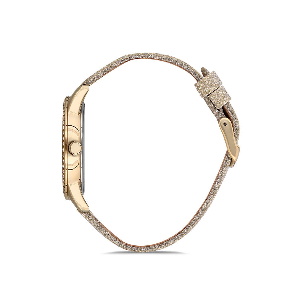 Cadran decorat cu zirconii si pudra de zirconii; carcasa decorata cu zirconii albe; curea decorata cu pudra de zirconii.
