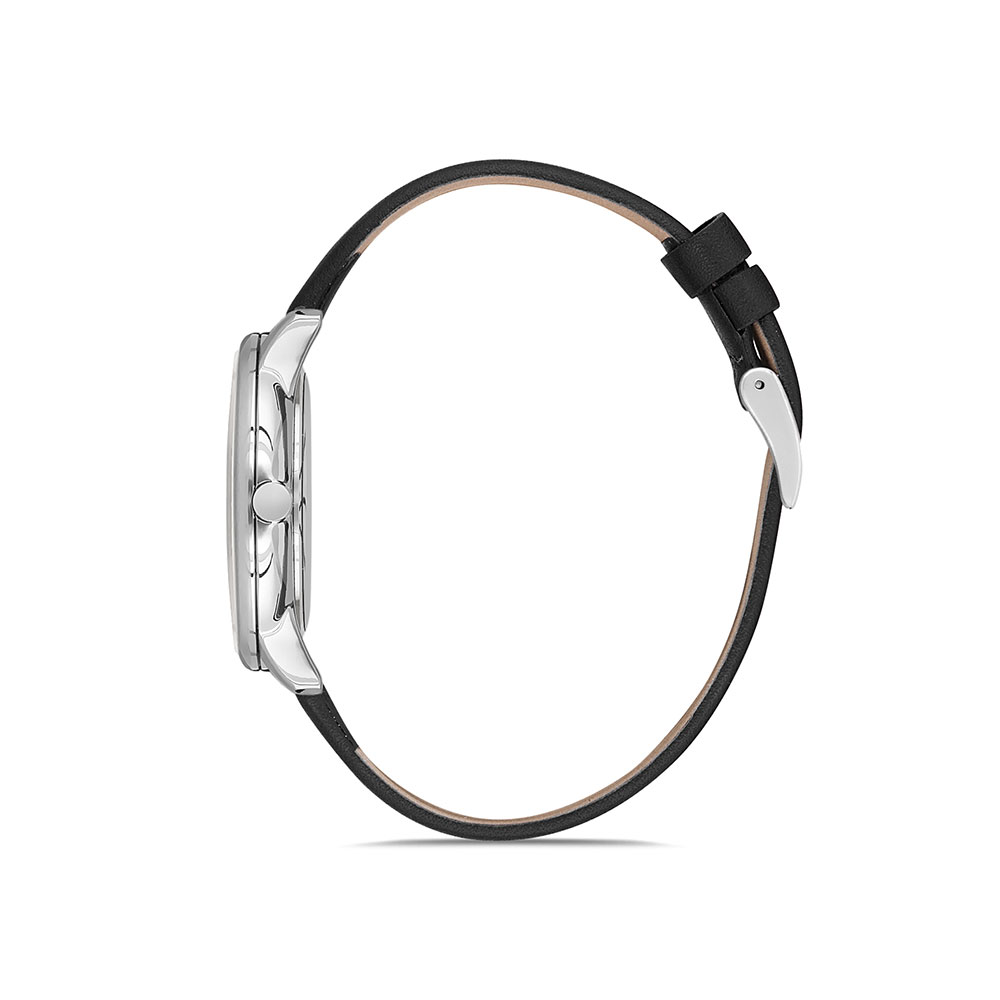 Carcasa argintie, realizata din aliaj metalic, completeaza armonios designul, iar cureaua din piele neagra asigura confort si durabilitate. Sistemul de inchidere cu catarama permite o fixare sigura si usoara.