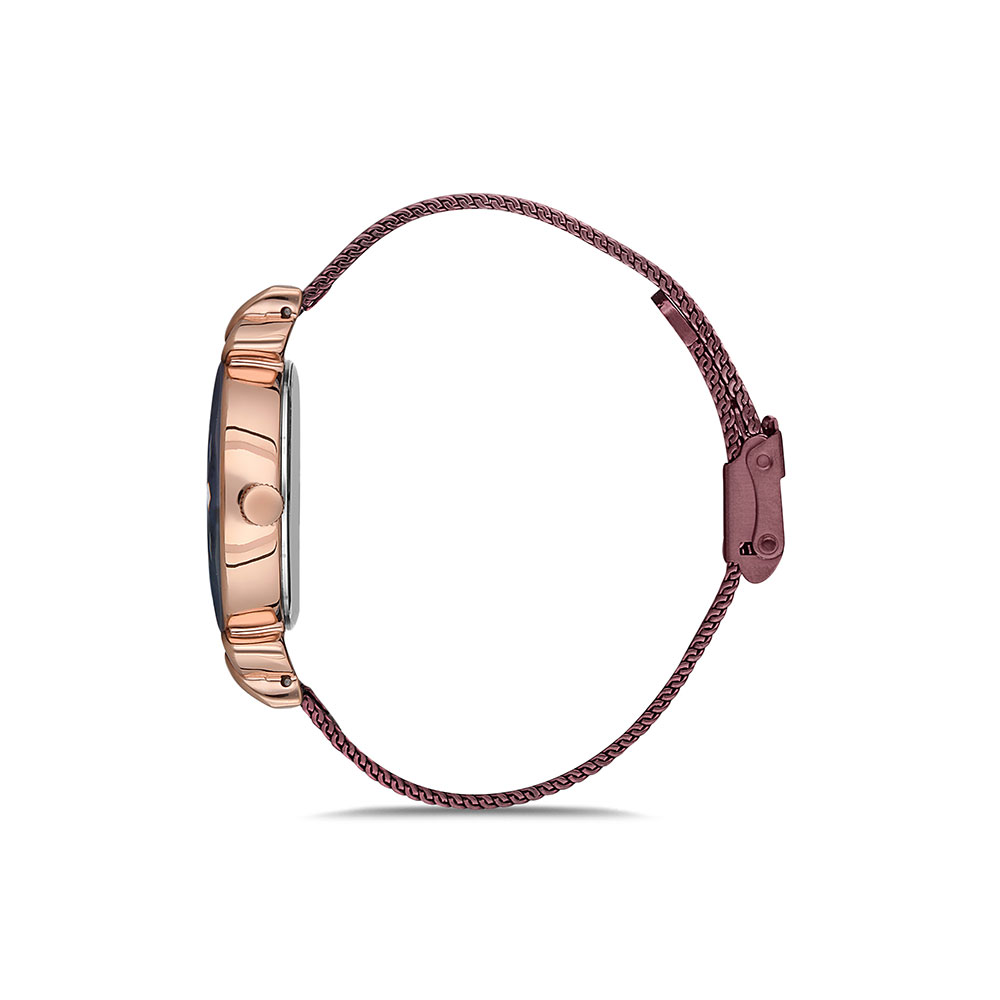 Cadran decorat cu zirconii multicolore; geam fatetat; bratara tip mesh, cu inchizatoare reglabila.