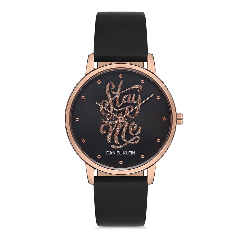 Cadranul negru, decorat cu mesajul stilizat Stay with Me in nuante aurii rose, adauga o nota de originalitate si expresivitate. Carcasa rotunda de 38 mm, realizata din aliaj metalic, are un finisaj auriu rose, completand perfect estetica moderna a acestui model.