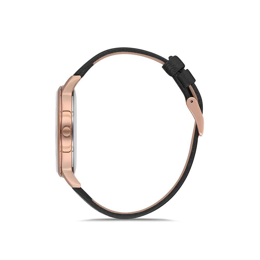 Cureaua din piele neagra ofera confort si durabilitate, fiind prevazuta cu un sistem de inchidere cu catarama pentru o fixare sigura pe incheietura. Mecanismul quartz japonez garanteaza precizie si fiabilitate, iar afisajul analogic pastreaza un aspect clasic si elegant.