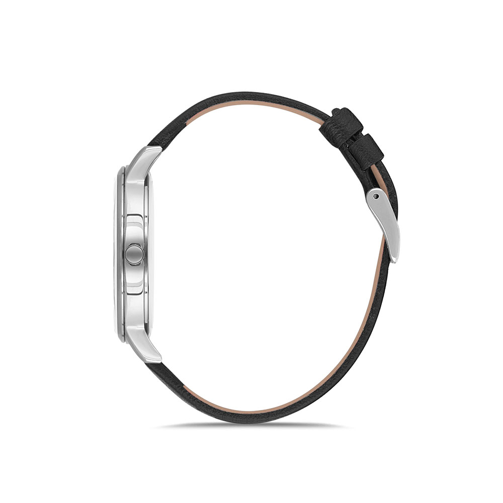Carcasa din aliaj metalic argintiu completeaza armonios designul, in timp ce cureaua din piele neagra garanteaza confort si durabilitate. Sistemul de inchidere cu catarama permite o fixare sigura si ajustabila.
