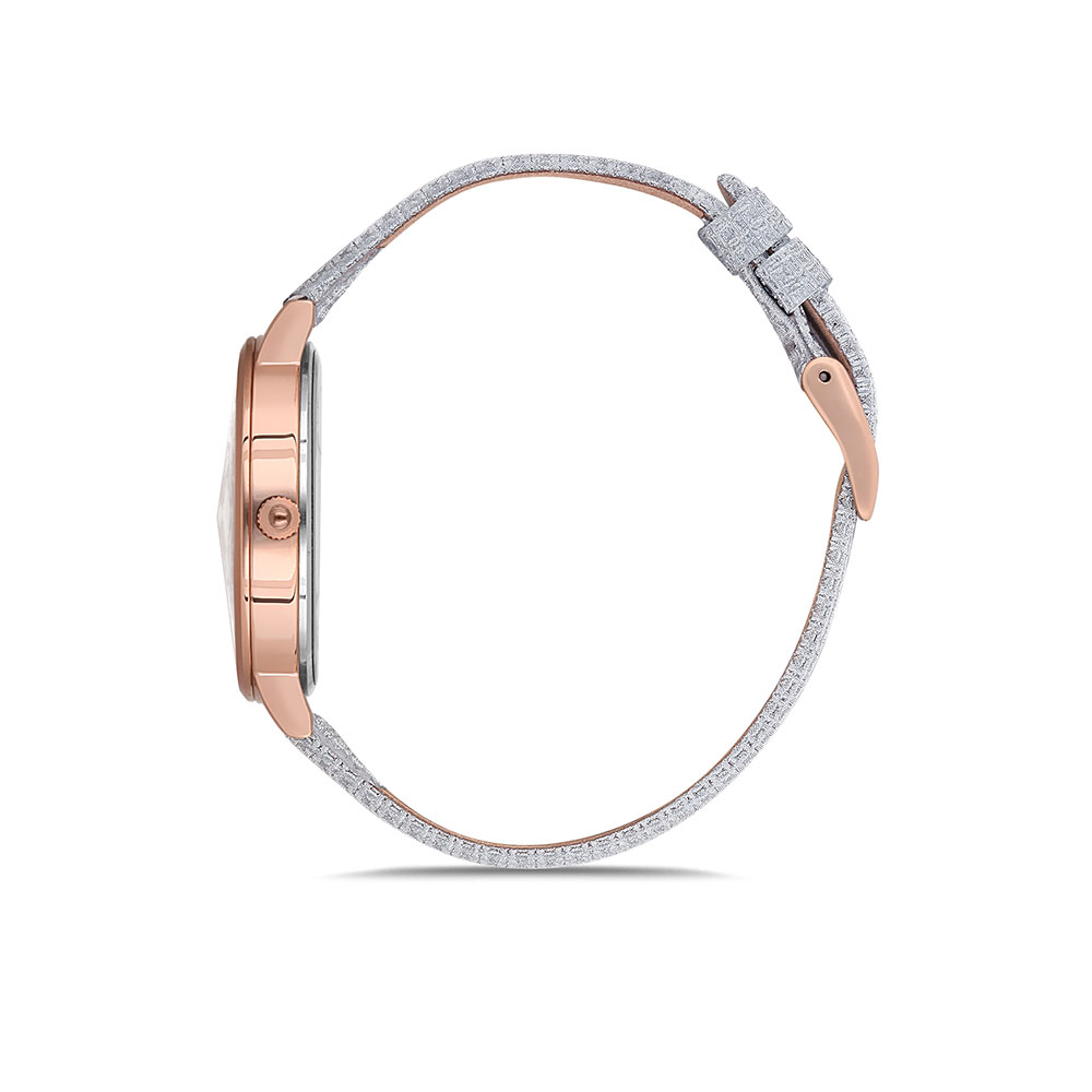 Cadranul degrade in nuante de gri si visiniu atrage privirile prin aspectul sau unic, fiind completat de o carcasa auriu rose din aliaj metalic, care ii confera un aer rafinat. Geamul din cristal mineral protejeaza cadranul impotriva zgarieturilor, asigurand durabilitate in timp.