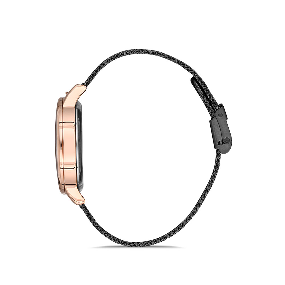 Cadran decorat cu pudra de zirconii; bratara tip mesh cu inchizatoare reglabila, avand lungimea utila 19 cm si latimea de 1.5 cm.