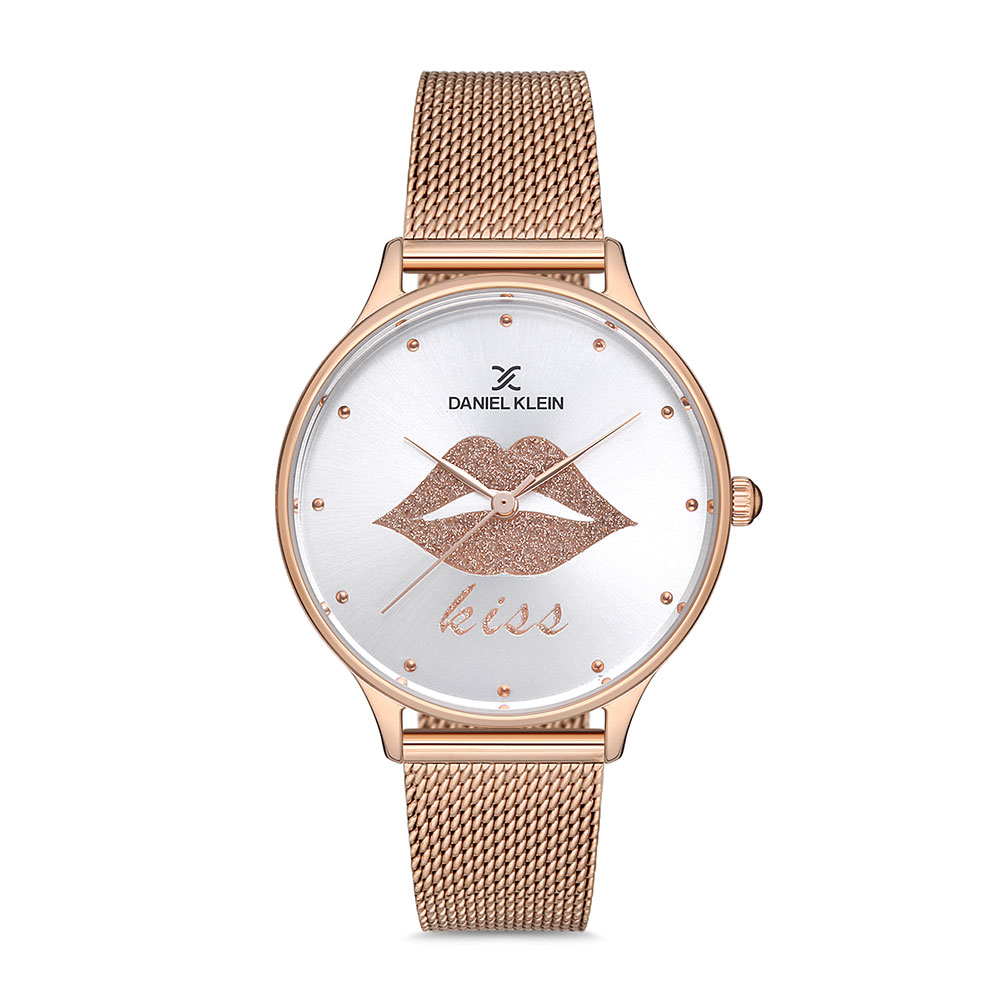 Ceasul impresioneaza printr-un cadran argintiu decorat cu un detaliu stralucitor in forma de buze si inscriptia "kiss", adaugand o nota jucausa si feminina. Carcasa rotunda de 36 mm este realizata din aliaj metalic cu finisaj auriu rose, completand perfect bratara fina din otel inoxidabil de aceeasi nuanta.