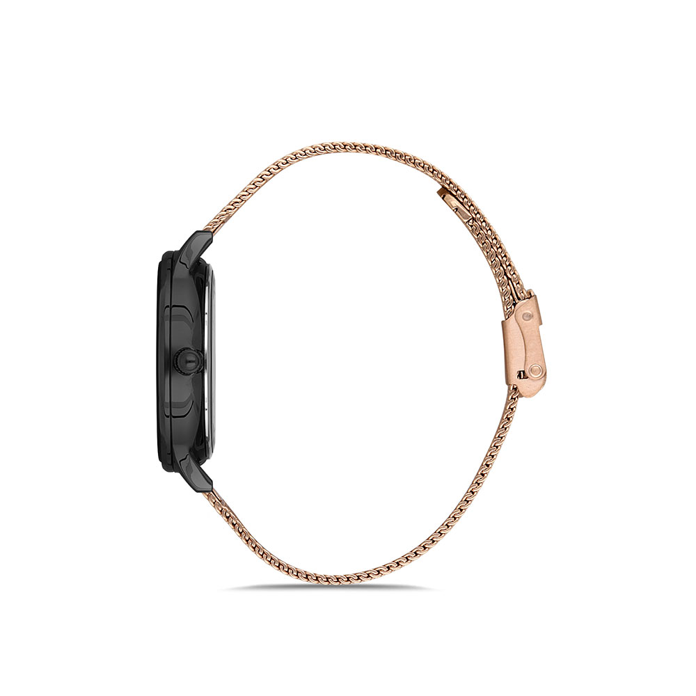 Bratara din otel inoxidabil auriu rose ofera confort si durabilitate, avand un sistem de inchidere reglabil pentru o potrivire perfecta. Carcasa neagra, realizata din aliaj metalic, asigura rezistenta in timp, iar mecanismul quartz japonez garanteaza precizia afisarii orei.