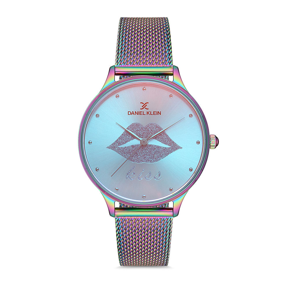- Cadran argintiu cu un decor stralucitor in forma de buze si detalii minimaliste pentru un look elegant.