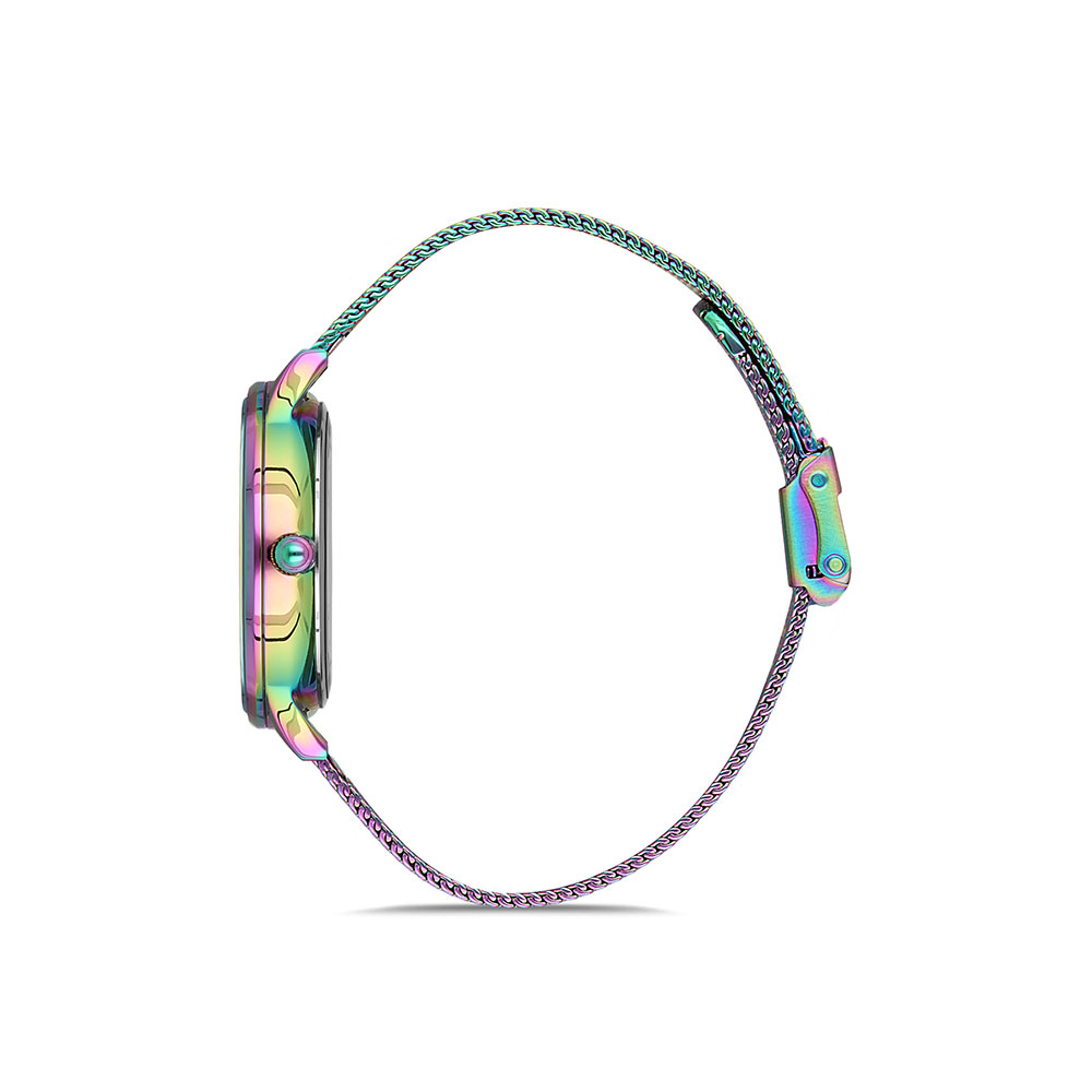 - Bratara din otel inoxidabil cu finisaj iridescent in nuante de mov, albastru si verde, oferind un efect vizual spectaculos.
