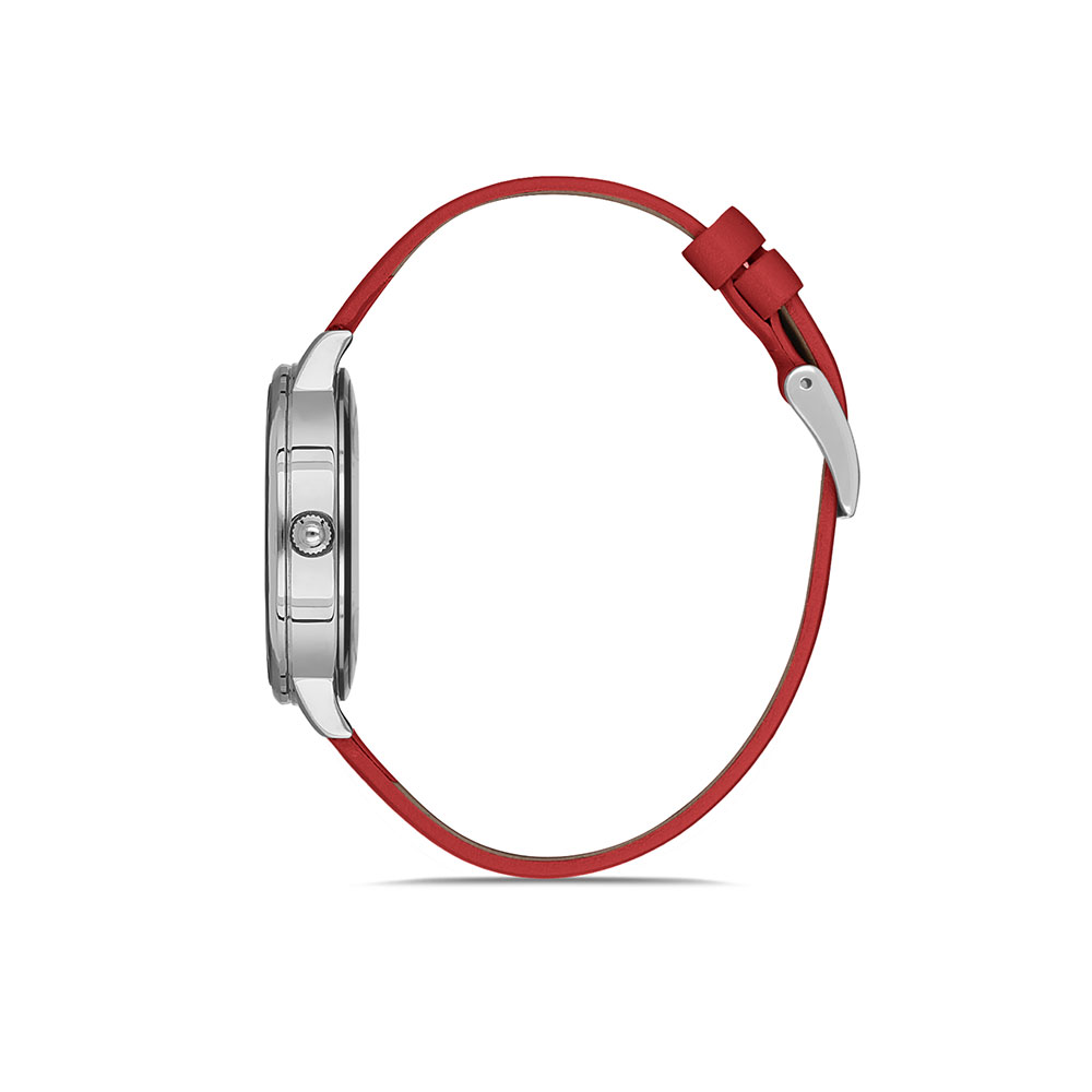 Cureaua din piele rosie, cu o lungime de 19 cm si latime de 1.4 cm, asigura un confort sporit si o potrivire perfecta pe incheietura. Sistemul de inchidere cu catarama permite o fixare sigura si usoara.
