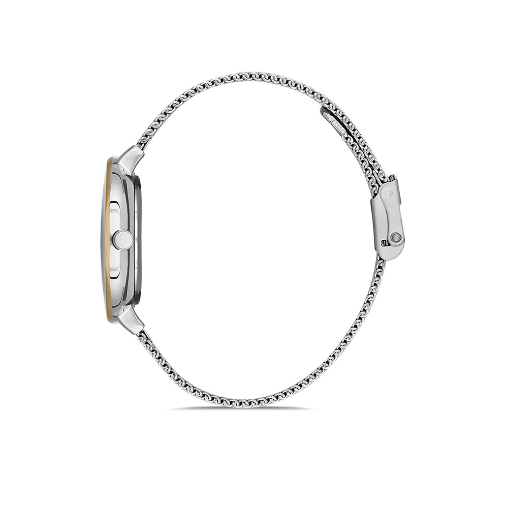 Cadran decorat cu inimioara si puncte; carcasa argintie, cu bezel decorativ auriu; bratara tip mesh, cu inchizatoare reglabila.