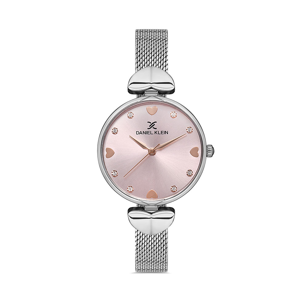 Cadran decorat cu inimioare si zirconii albe; bratara tip mesh, cu inchizatoare reglabila.
