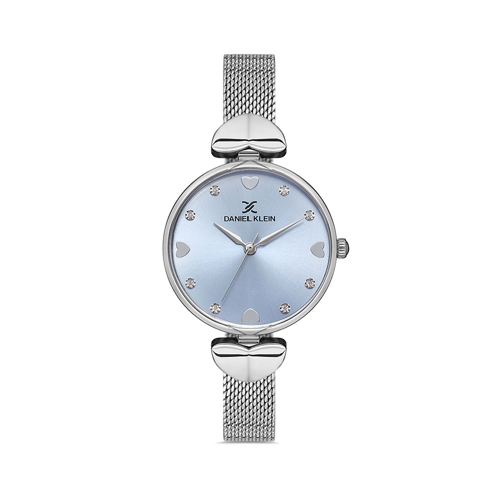 Cadran decorat cu inimioare si zirconii albe; bratara tip mesh, cu inchizatoare reglabila.