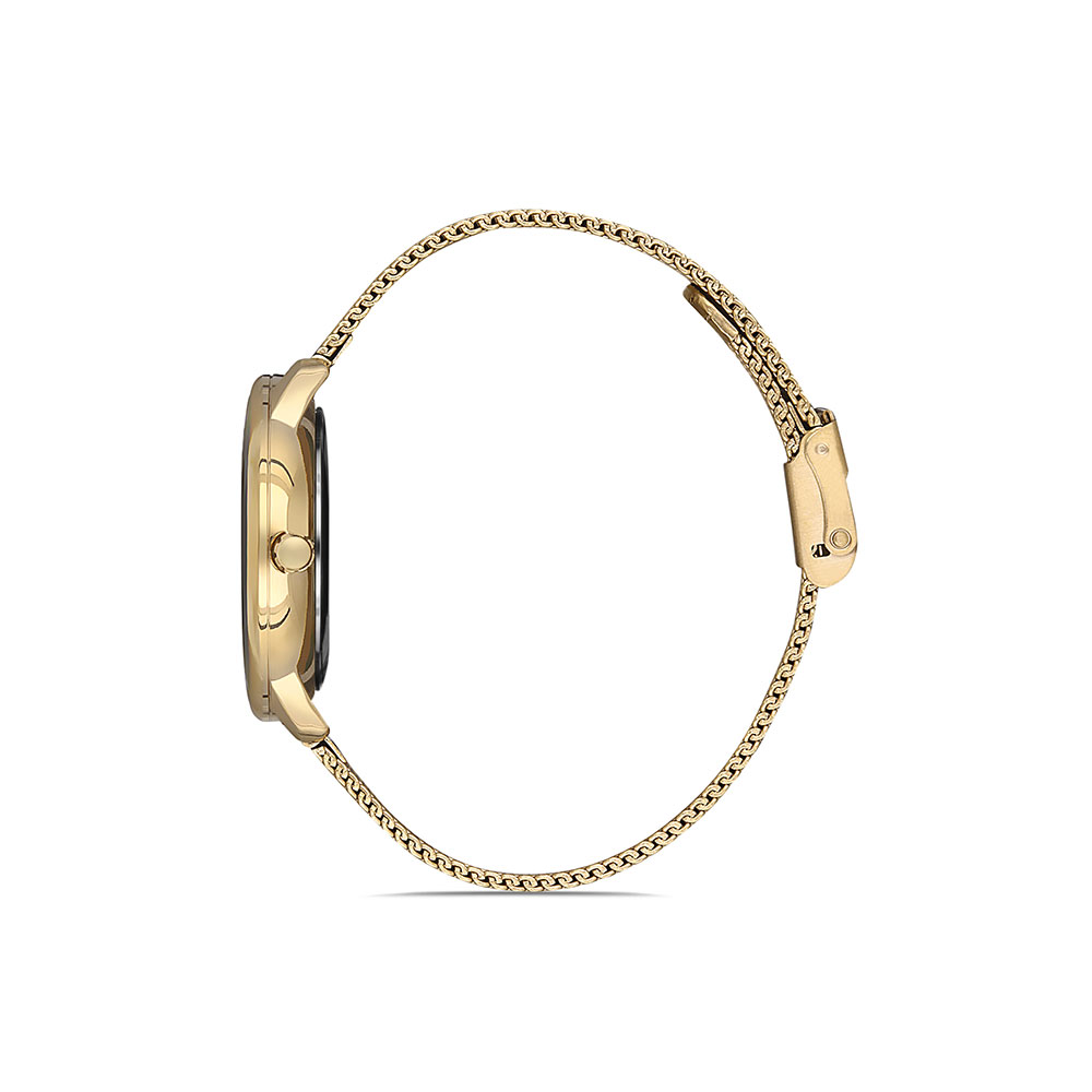 Cadran decorat cu inimioare si zirconii albe; bratara tip mesh, cu inchizatoare reglabila.
