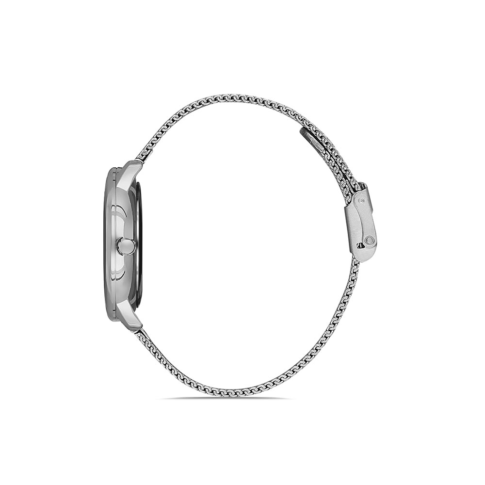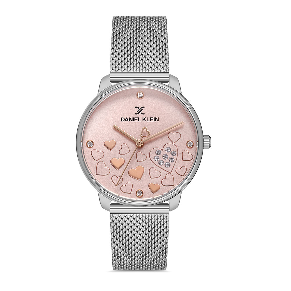 Cadran decorat cu inimioare si zirconii albe; bratara tip mesh, cu inchizatoare reglabila.