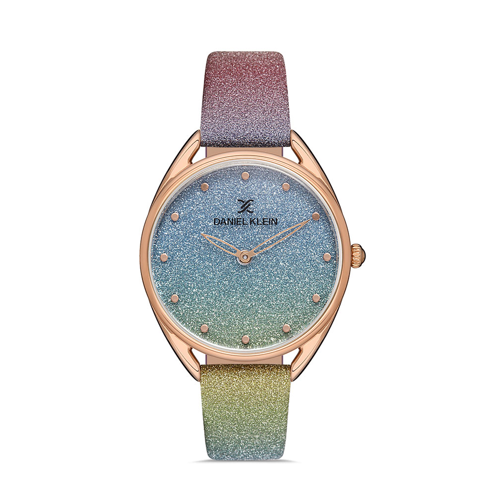 Cadranul rotund, decorat cu un efect spectaculos de sclipici in nuante de albastru, verde si roz, adauga un farmec aparte, iar marcajele punctate completeaza aspectul minimalist si elegant. Carcasa aurie rose din aliaj metalic confera un plus de rafinament si rezistenta.
